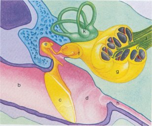 botjes (e) in het middenoor (d) in beweging. Deze geven op hun beurt de beweging