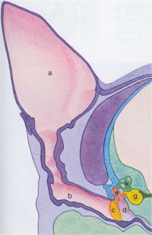 trechtervormige buitenoor, de uitwendige gehoorgang (b) en doorgegeven naar het