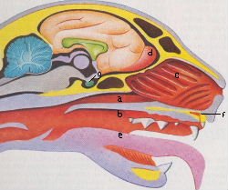 met elkaar verbonden doordat de Neusholte (a, rood) uitkomt in de bek (b, rood).
