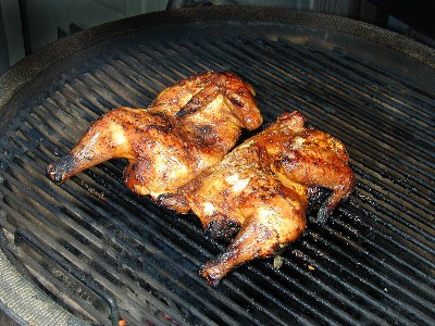 Daarna wordt de BBQ lekker opgestookt tot een graad of 220, de kippenpoten of kip leg je op het rooster, 15 minuten wachten en je kunt aan tafel of aan het bakje.